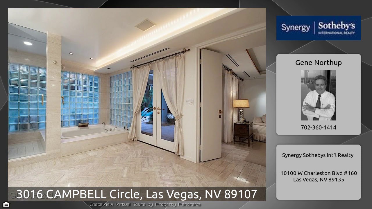 The Virtual Tour for the property at 3016 CAMPBELL Circle, Las Vegas, NV 89107 listed for $1,100,000: Other homes for sale by Gene Northup of Synergy Sothebys Int'l Realty: Modern contemporary single-story home with open floor plan, sunken living room, 15’ coffered ceilings, skylight and fireplace. Fully-equipped kitchen granite island, sub-zero side-by-side refrigerator, 6-burner stovetop, dual ovens, breakfast nook, dining room. Master suite, exposed beams, walk-in closet with French doors opening to patio, and master bath with reflective lighting, jetted tub and shower. Backyard stone patio, …