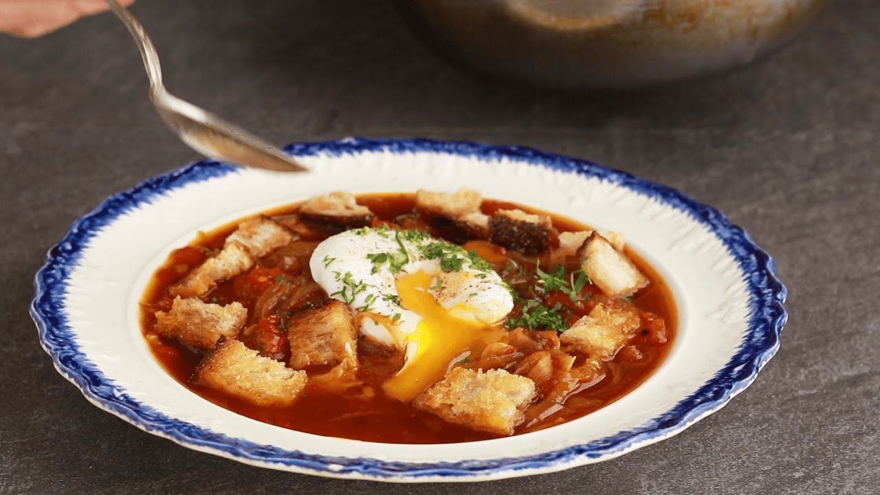 Pour the soup into bowls, top with toast pieces (recipe follows) and poached eggs (