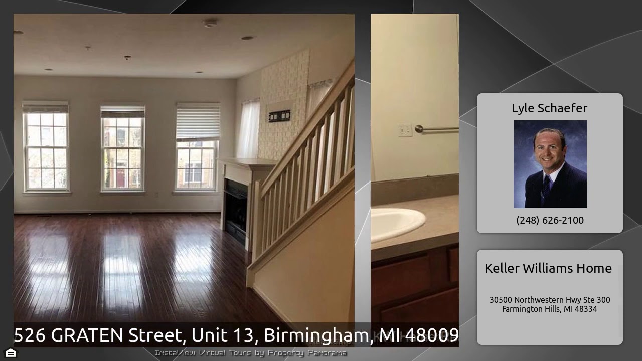 The Virtual Tour for the property at 526 GRATEN Street, Unit 13, Birmingham, MI 48009 listed for $2,950: Other homes for sale by Lyle Schaefer of Keller Williams Home: 2 bedroom 2 bath end unit with side windows that add much natural light. features include: Library with French doors, Living room, Kitchen and dining room have hardwood floors. Dining room has door wall to balcony. Living room with fireplace. Master bedroom with walk in closet and full bath. Highest level is family room/ great room has 1/2 bath and loads of potential. Two car attached tandem garage
