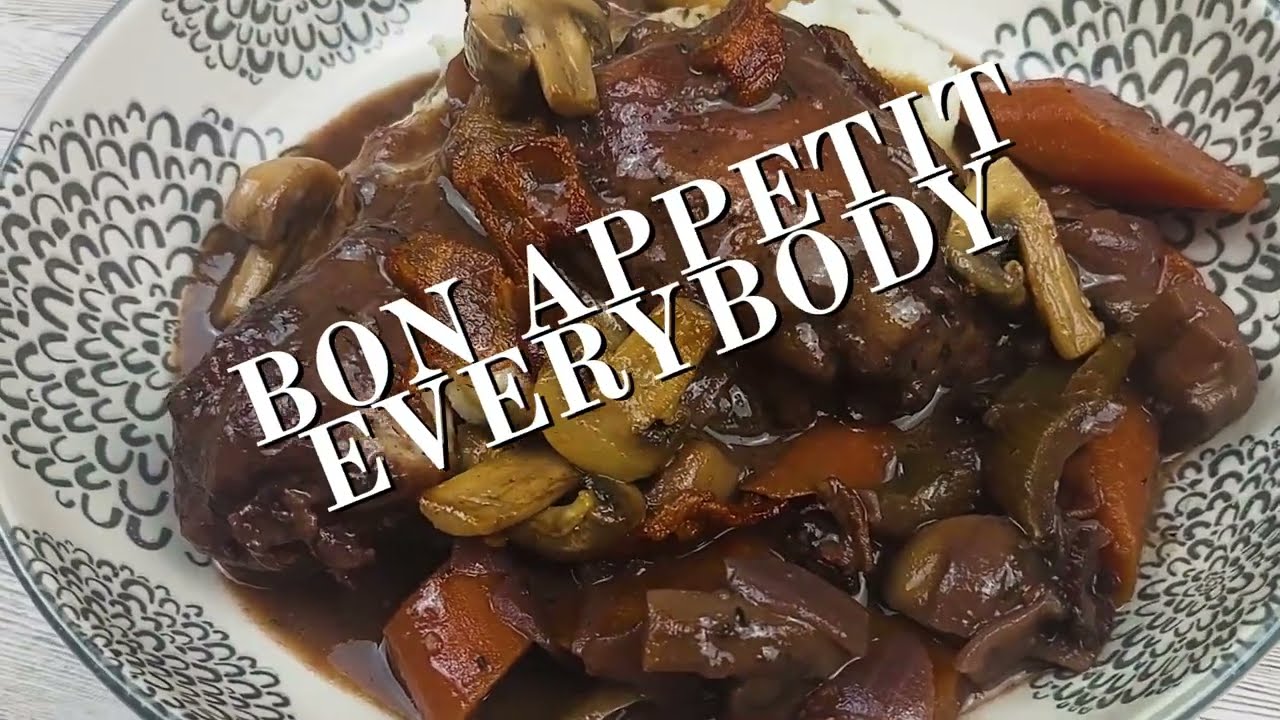 Coq au Vin is the well known French chicken stew where chicken pieces are braised in a luscious, red wine sauce with bacon, mushroom and onions.