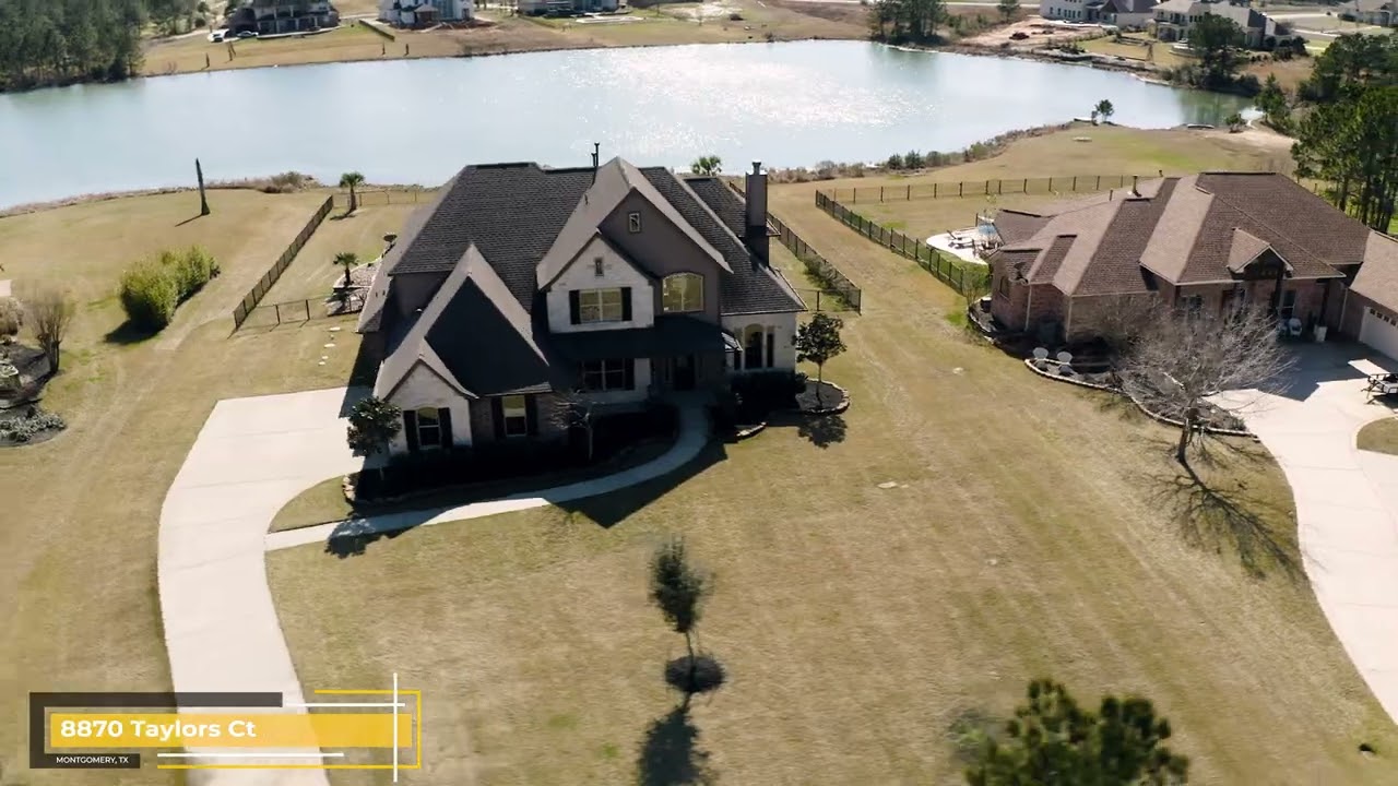Incredible waterfront views and a gorgeous back yard with sparkling pool/spa (2019), cool deck, covered back patio, firepit and so much more. High ceilings with lots of natural light. Study with French doors, formal dining, gourmet kitchen with stone faced breakfast bar, pull out spice drawers either side of the gas range, double oven, recent microwave, under cabinet lighting, butlers pantry & walk in pantry. Two story family room with gas log fireplace. Surround sound. Extensive wood floors, huge master retreat, his and hers closets, large shower with rain head, whirlpool tub. Upstairs 3 secondary bedrooms with two full baths and a game room. Utility room stubbed for a sink. Cul-de-sac, approximately 1 acre lot in the desirable, private gated golf course community of Grand Lake Estates.