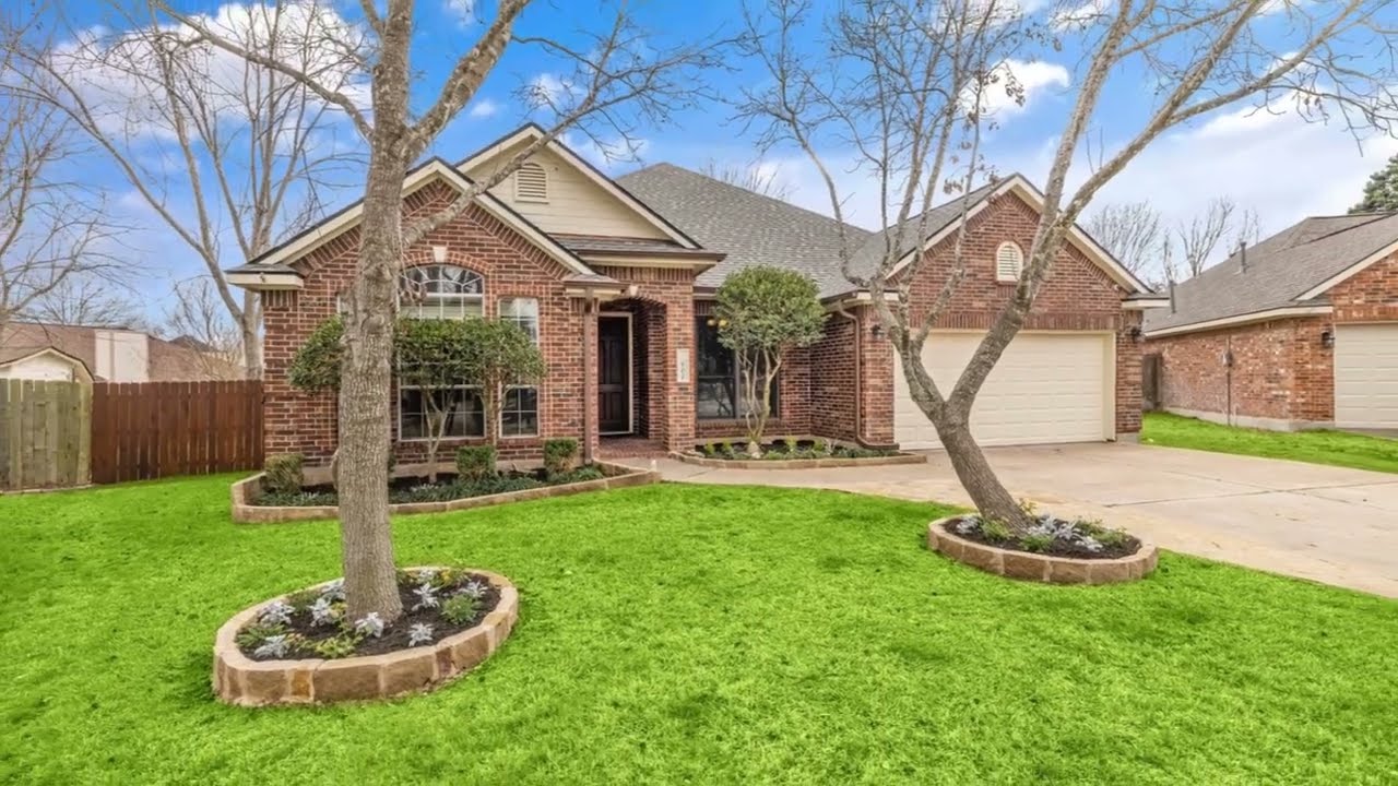 Stunning 3/2 home in Oak Ridge on an oversized cul-de-sac lot within walking distance to the community park, playground, sports courts, and pool! Voluntary HOA! Bursting with curb appeal, this stunning single-story home offers professional landscaping and a lovely paved walkway that leads you welcomes you inside. The interior is well-designed for entertaining with a fabulous open floorplan and lots of natural light courtesy of the large Anderson windows that can be found throughout the home. Living and dining formals can be found off the main entry along with glass-panel french doors that lead to the casual dining area and kitchen. The gourmet kitchen is bound to impress and is appointed with modern granite countertops, two-tone cabinetry, high-end Thermidor appliances, and a spectacular brick facade that adds so much character to the space. The kitchen opens to the family room where you can gather around the cozy wood-burning fireplace. A study is located off of the living room space. The primary bedroom is separate from the secondary bedrooms with lovely views of the private backyard, a walk-in closet, and an en-suite equipped with a double vanity, a walk-in shower, and a large soaking tub where you can relax and unwind. The secondary bedrooms are well-sized and share a guest bathroom with white cabinetry, bronze hardware, and shiplap detailing. The oversized backyard provides the perfect setting for outdoor enjoyment with a wood privacy fence, mature trees that provide excellent shade, and a gorgeous cedar deck. Storage shed will convey. Located just minutes from 183, with a variety of shopping and dining right at your fingertips. The Sellers replaced the HVAC and Water Heater. Only 1 year old Roof! Zoned to exemplary Leander ISD schools. Schedule a showing today!