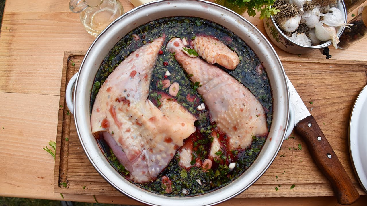 Homegrown free-range rooster is marinated in home red wine with garlic, herbs, and spices which help the meat to become tender and give it its unique color and aroma.