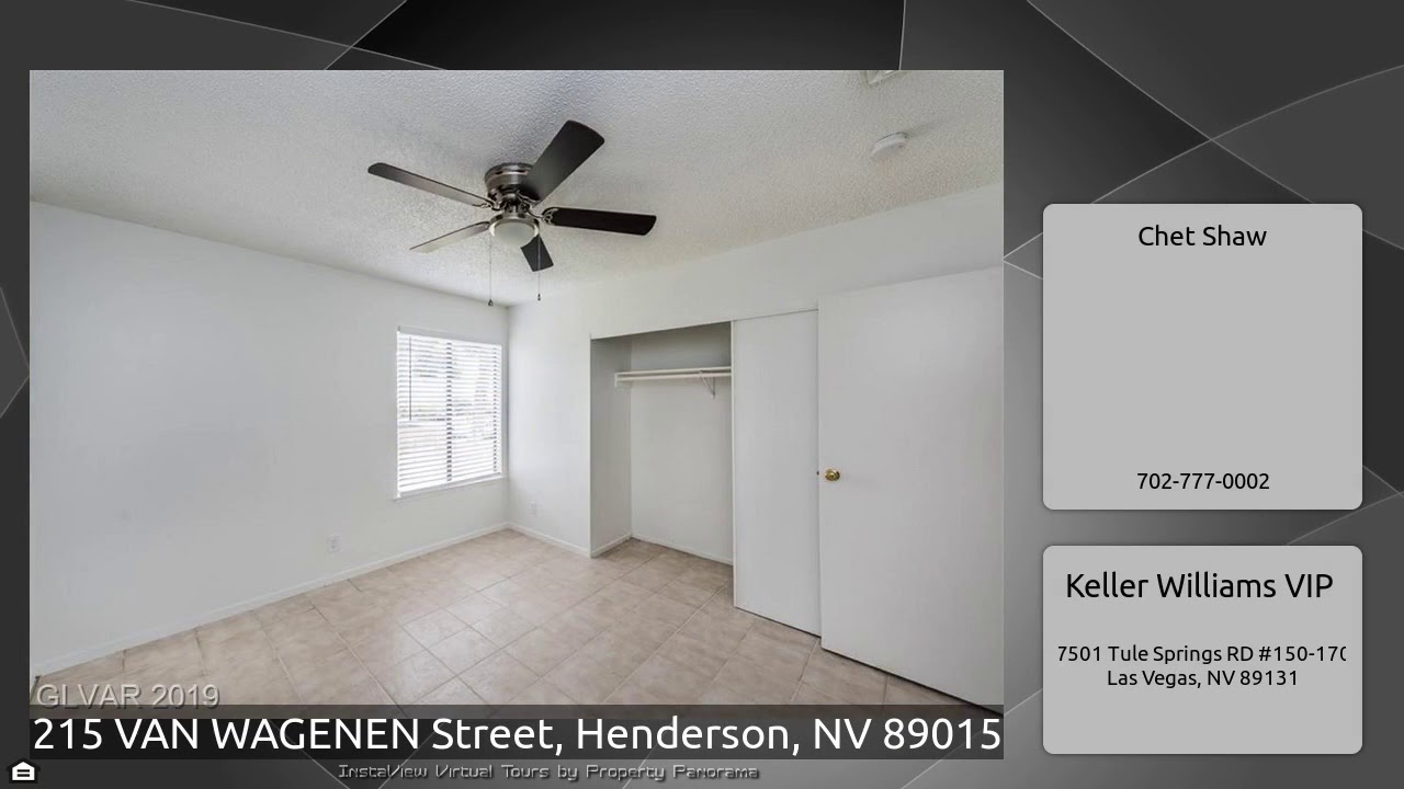 The Virtual Tour for the property at 215 VAN WAGENEN Street, Henderson, NV 89015 listed for $120,000: Other homes for sale by Chet Shaw of Keller Williams VIP: Welcome home to your two bedrooms, 1 bath townhouse. All tile/ceramic flooring, freshly painted, the bathroom has been updated. Ceiling fans in each room. Private patio off the Kitchen/Dining area through the double French doors. Washer dryer hookup in the patio area. No neighbors on three sides and, near downtown Henderson area.