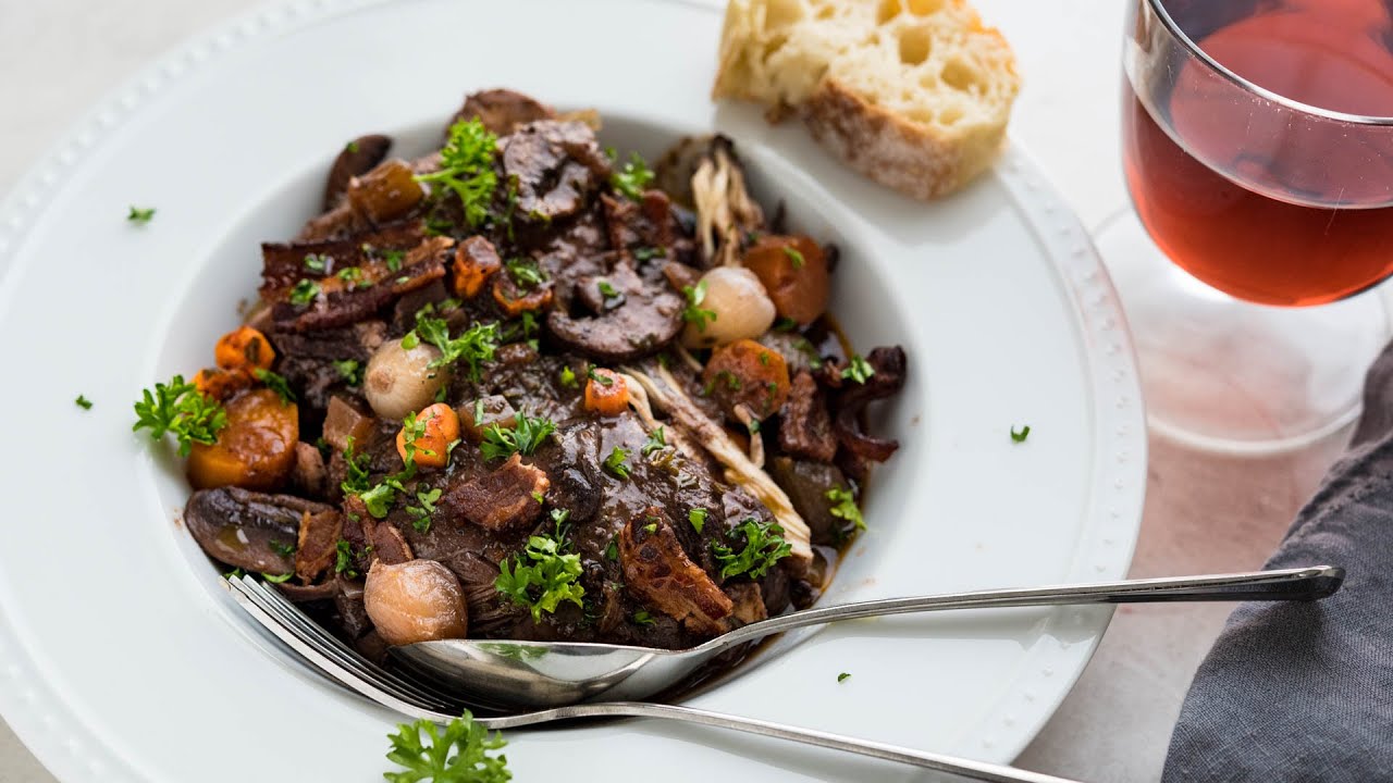 Coq Au Vin is a classic French chicken stew made with red wine, mushrooms and a little bit of bacon.
