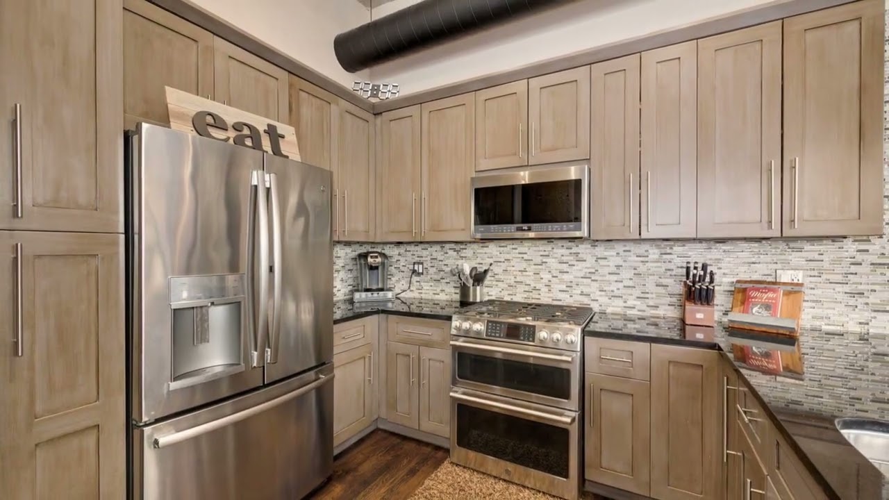 WARM CONTEMPORARY CONCRETE LOFT | Check out this handsomely designed corner 2 bed/2 bath authentic West Loop loft with massive black pane windows and exposed brick walls. The rich hardwood floors throughout the home complement the warm white stacked stone feature fireplace and concrete ceilings perfectly. The kitchen, open to the dining and living areas, offers gray wash shaker kitchen cabinets, under cabinet lighting, built-in wine fridge, french door SS refrigerator, slide in gas range, micro hood, and newer dishwasher. The master suite offers a large walk-in closet plus ensuite bath with dual vanity, designer tile, and air tub. The second bath features shower body sprays and a modern frameless glass door. Other highlights include the large, tucked-away laundry room with front-loading LG washer/dryer. This home is ready to entertain with smart lights and thermostat, dry bar, custom barn door, surround stereo and speakers. There is one indoor garage parking spot for an additional 30k. The common rooftop deck allows for relaxing, entertaining, working from home, or simply gazing at the dazzling skyline views. Easy walk to shops and restaurants on Madison Street or Restaurant Row (Randolph).