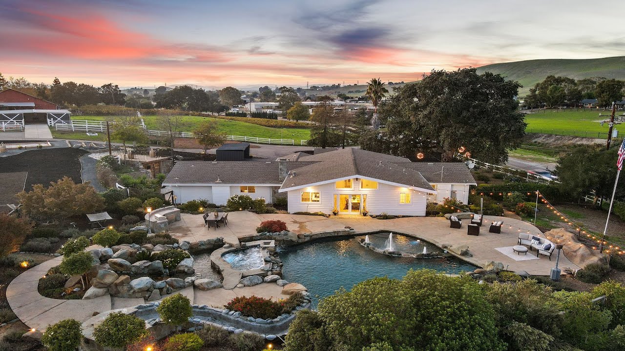 Majestic oak trees. Usable 4.65 acre parcel.Irrigation system.Paved driveways.Various pastures. Bocce Ball Court. Stable. Rear Yard Retreat. Expansive patio is perfect for a party under the festival lights. Panoramic views of the wineries. Professional lighting and crushed granite walkways. Built-in barbeque. Sparkling Blue Swimming Pool.Saltwater chlorination system. Shallow pool area, perfect for young children.Water slide.Spa with strong jets. Large spillway area with custom tile work.Solar heating.