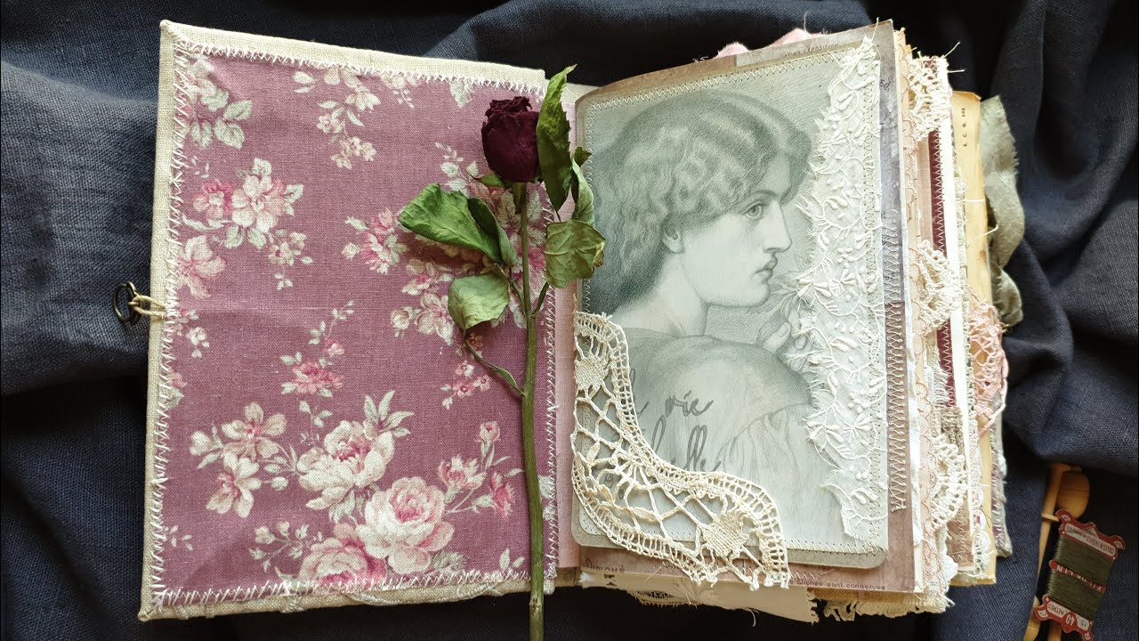 The journal is embellished with more than 10 varieties of fabrics including from an antique linen night gown, and over 40 varieties of antique and vintage laces and embroideries, as well as some old glass and metal buttons. It also contains an unfinished handmade lace on its pattern from the 19th century.