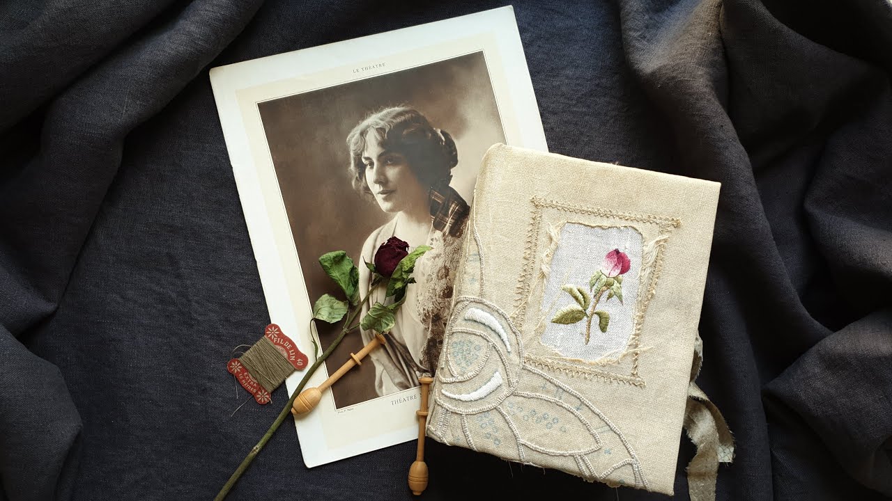 This journal has a soft (but robust) textile cover made from a 19th-century linen tablecloth with an unfinished roses’ embroidery and embellished with a tender rose bud, which I have hand-embroidered in the needle-painting technique.