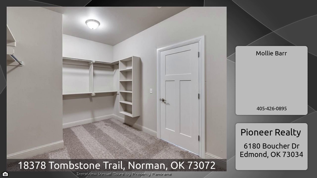The Virtual Tour for the property at 18378 Tombstone Trail, Norman, OK 73072 listed for $282,111: Other homes for sale by Mollie Barr of Pioneer Realty: Half acre homesite! Lots of great storage! Beautiful curb appeal, our Lombard plan opens to a study with French doors. The large study has a walk-in closet! This home has an open concept feel, great for entertaining in the kitchen, living, and dining space. This home design includes a gorgeous kitchen featuring beautiful cabinetry to the ceiling, spacious island and pantry space. Tucked away down the hall is the private master suite with dual …