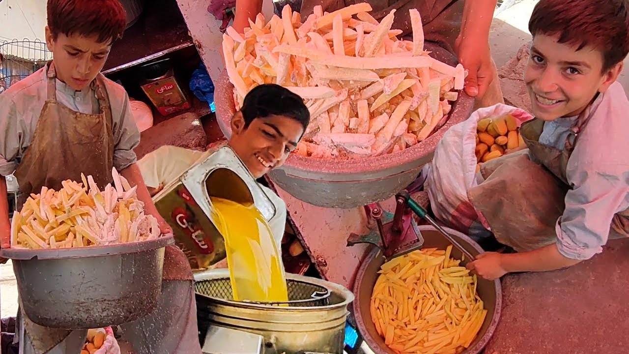 14 Years Old Kids Making French Fries on Road. Hardworking Little Boys Selling Potato Fried Chips. Street Food French Fries Making By Afghani Kids in Karachi Food Street.