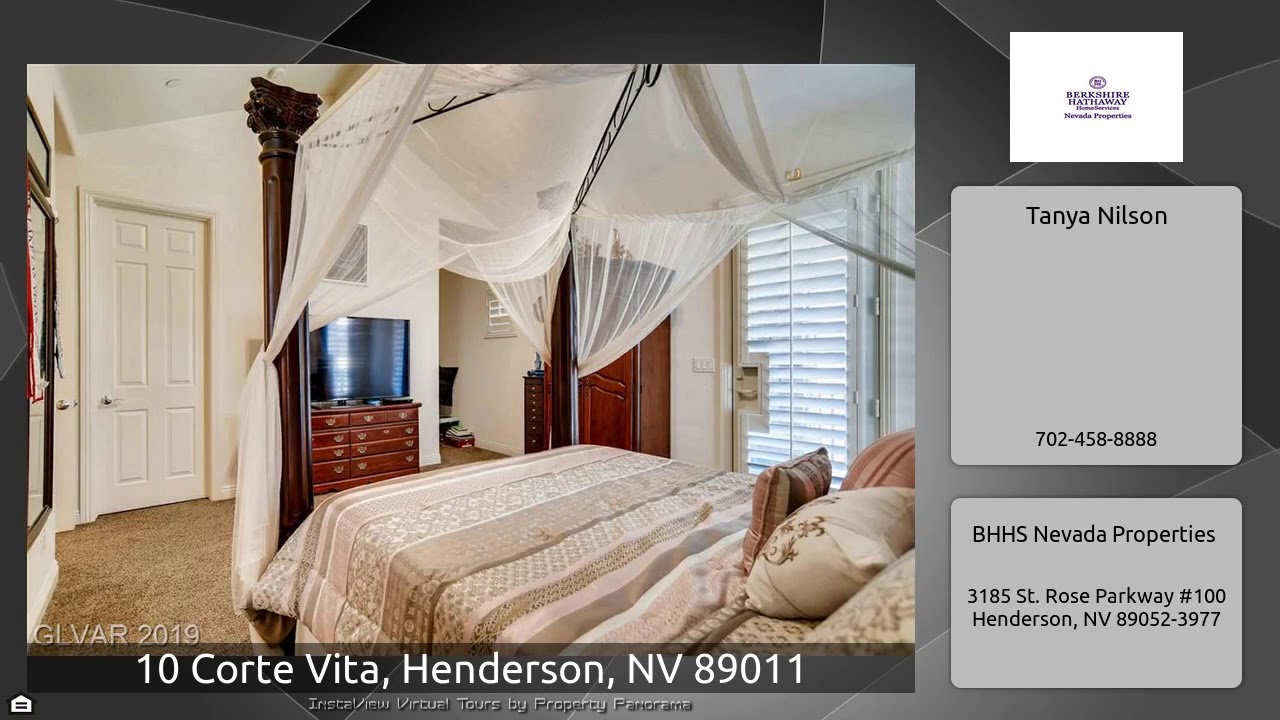 The Virtual Tour for the property at 10 Corte Vita, Henderson, NV 89011 listed for $399,750: Other homes for sale by Tanya Nilson of BHHS Nevada Properties: Lake Las Vegas living! Upgraded Toll Brothers town home! Large end unit with plenty of living area. Short walk to the community pool with views of a sandy beach and the lake. Home features french doors that open to a generous patio. Luxurious master bedroom w/2 balconies and an en suite bath. Formal dining room overlooks a formal living room that is perfect for entertaining. Garage is huge! & has an extra storage space .