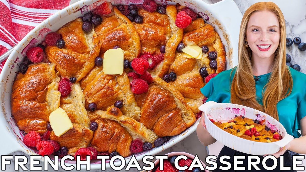 You’ll love this easy, hands-off overnight Croissant French toast casserole recipe! This easy recipe is made with buttery croissants, a maple and cinnamon egg custard, all layered with tons of berries. Serve it with dabs of butter and more maple syrup on top! You can prepare it the night before, then bake in the morning for a hot and delicious, sweet breakfast! Alternatively, you can bake it right away. This is one of my favorite breakfast recipes!