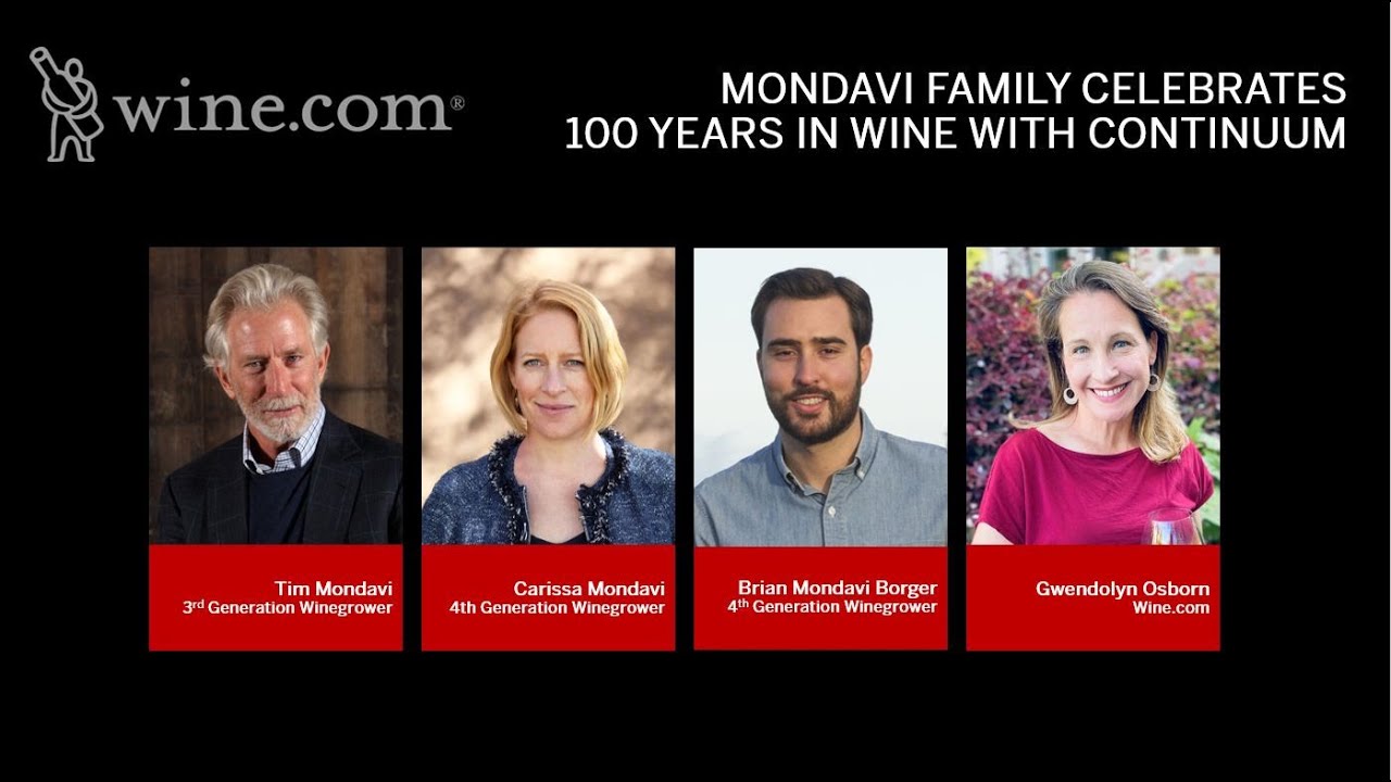 Watch a tasting to celebrate 100 years in wine and an unbroken string of 100 harvests with the Mondavi family! 2019 Continuum is a singularly significant vintage marking the 100th harvest for the families of Tim and Marcia Mondavi. A family journey that has taken many forms, but step by step, generation by generation, is marked by a forward pursuit of excellence in wine. Humble beginnings in grape shipping has led to an elevated and global perspective of fine wine cultivated at Robert Mondavi Winery and through partnerships around the world that included Opus One, Sena, Luce and Ornellaia. This elevated experience in fine wine grows even deeper today with Continuum, a culmination of four generations. Wine.com host Gwendolyn Osborn leads this special tasting of the 2019 vintage with Tim Mondavi (3rd Generation), Carissa Mondavi (4th Generation) and Brian Mondavi Borger (4th Generation).