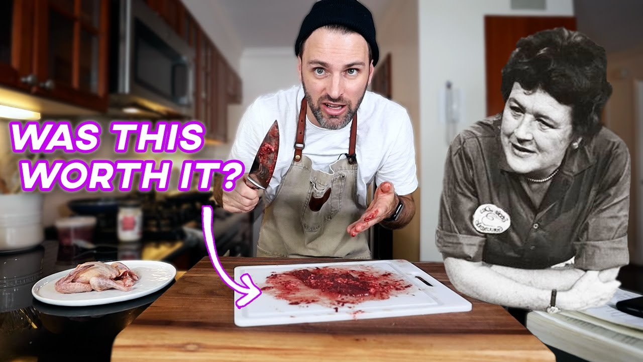 Julia Child’s Small Roast Chicken (or pigeon, dove, partridge, quail) with chicken liver canapés and mushrooms with sauteéd potatoes. Recipe from Mastering the art of french cooking volume 1. #juliachild #jamieandjulia #antichef