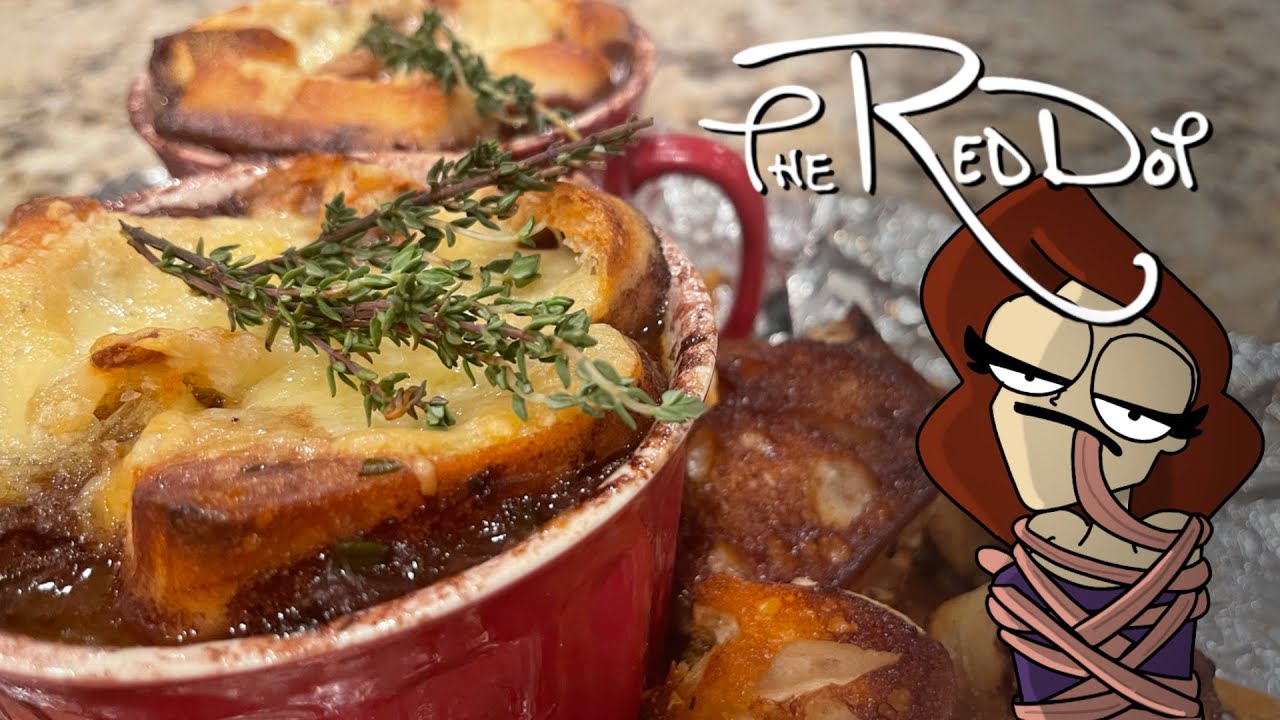 Once soup is reduced, ladle into ramekins and fit bread to cover the surface of the bowl then top with a gracious amount of cheese.