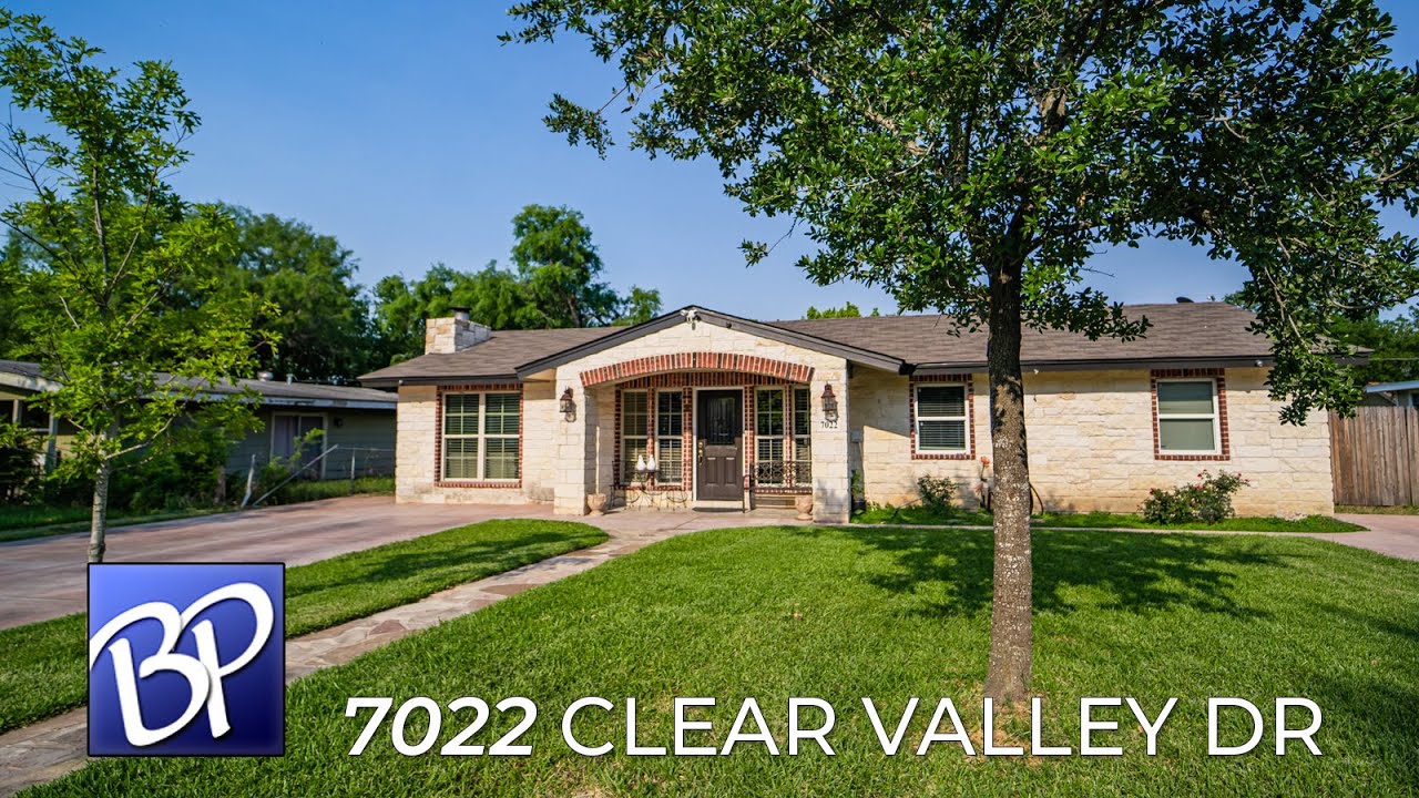 Welcome home to 7022 Clear Valley Dr. This 1,488 square foot single story home has been meticulously landscaped and features a stone and brick exterior, an inviting covered front patio, two separate drive ways, and a stone pathway leading to the front door. Additionally this home comes loaded with a 2 year old roof a 4 year old a/c and a sprinkler system. As you enter, you’re greeted with a formal seating area and an eye catching grand arched white stone wall.