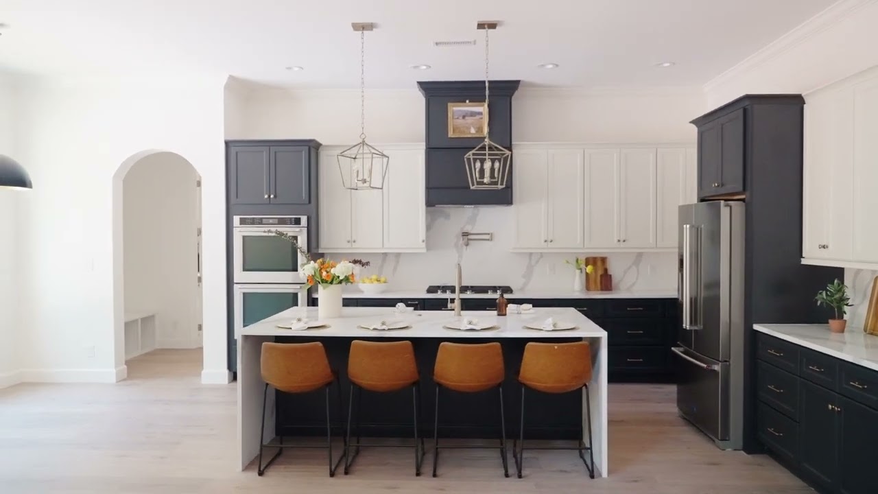 The KD Hambright is a beautiful French-inspired home. A 4000 sq ft home with a tuxedo kitchen, walk-in wine cellar, custom beams, and fireplace surround, luxury master bathroom, and more! This home build has beautiful designs and European architecture.