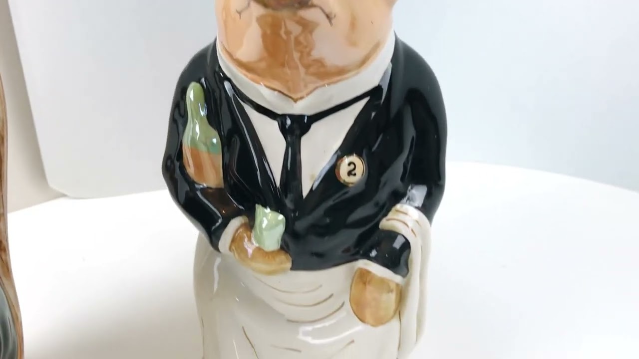 Each pitcher, called “maitre d’hotel” (or butler), features a pig dressed as a waiter and seated on a chair. It is known as the ‘Maitre d’Hotel’ with a wine bottle tucked under one arm.