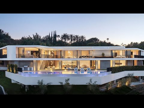Both bold and dynamic, formal and intimate, exclusively sited with sky-sweeping views, the genius of synchronous design by world-renowned Zoltan Pali is defined in this architectural residence overlooking the manicured fourth green of Bel Air Country Club and adjacent to a serene Japanese Garden. The home’s horizontal yet fluid rhythm begins as the cobblestone courtyard unveils the skyline view, carries through the privately gated and modest entryway and flows into an unassuming reveal of the 17,401 square-foot masterfully crafted eight-bed, eleven-bath residence with all three levels anchored by a striking staircase. The modernist architectural exterior was crafted with Indiana limestone and curved bronze metalwork to complement the tranquil refined palette, thoughtfully angled with a blended wall-cladding of travertine and board-form concrete and French walnut floors. A generous use of glass, sliding doors on each bedroom, and two levels of day-lit space with oversized spacious decks and an infinity pool together create an extension of outdoor living to the floor space. The west wing of the top level offers an open kitchen with breakfast area complete with a blend of Miele, Wolf, and Sub-Zero appliances, Ceppo di Gre stone, dining room, expansive living room separated by travertine fireplace, and guest quarters. The southeast corner is devoted to the primary suite and the emerging olive treetop of the two-story courtyard. The lower level, an amenity showpiece, includes a mini primary suite, a gym, wellness center, family room, and additional en-suite bedrooms, all opening to the floating deck with pool and spa. The lowest level completes the home with staff quarters, a theater, and a wine room. A masterwork home by Viewpoint Collection, positioned on one of East Gate Bel Air’s finest streets.
