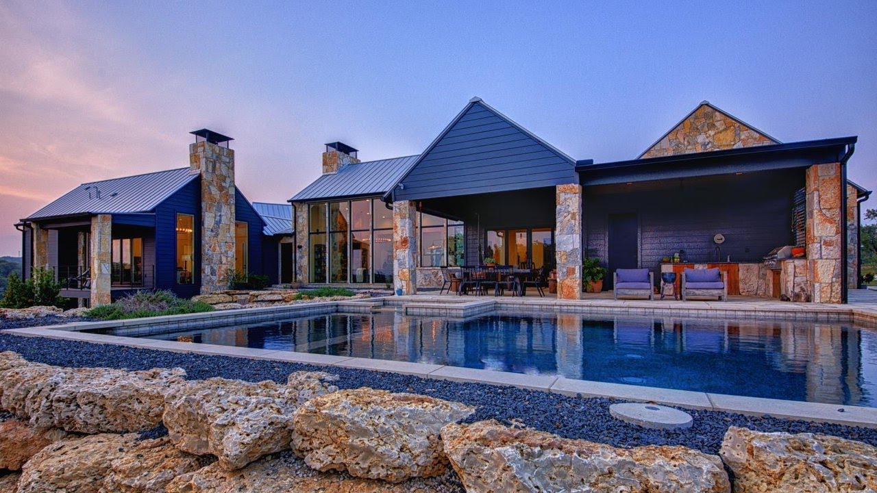 See the Property Website! :: Craig Van Engelen – 512-800-1138 :: This custom hill country estate captures the essence of serenity & tranquility & is surrounded by majestic oak trees on a sprawling 30+-acre ag-exempt property with over 5,200 square feet of elegant living space, an expansive back patio & stunning custom pool/spa, & a separate 3,000 square foot stone barn perfect for hobbyists, RV/boat storage, & more! Light hardwood flooring flows throughout the modern rustic style home featuring an open concept floorplan with lots of natural light courtesy of soaring ceilings & floor-to-ceiling windows that offer picturesque views year-round. The spacious living room offers a towering stone fireplace & provides plenty of space to host social gatherings. The gourmet kitchen boasts a massive center island & breakfast bar, a Lacanche French range, high-end quartz countertops, trendy polished brass hardware, custom open shelving, & a custom walk-in pantry. A 2nd dining area or flex room is located off the kitchen with glass french doors that open to the covered back patio. The luxurious owner’s retreat is complete with a modern chandelier, a vaulted & beamed ceiling, a custom walk-in closet, a stone fireplace, & direct access to a private patio. Rejuvenate & refresh in the spa-like primary bathroom well-equipped with separate quartz-topped vanities, an upscale freestanding soaking tub, & a huge walk-in shower. The floorplan also incorporates 3 bedrooms, a pool bathroom, an executive home office, a game/media room, & home gym (walkout basement) with a huge storage room. The private backyard is the perfect spot for entertaining with an expansive covered patio, built-in gas grill, fire pit, & stunning custom pool & spa – all with a hill country & sunset backdrop. The property offers a 40,000-gallon rainwater harvesting system & $300k professional landscape design. A great horse property with a fenced pasture & water tank. 10 motorized sunshades on inside & outside of house. 10 minutes from downtown Wimberley!