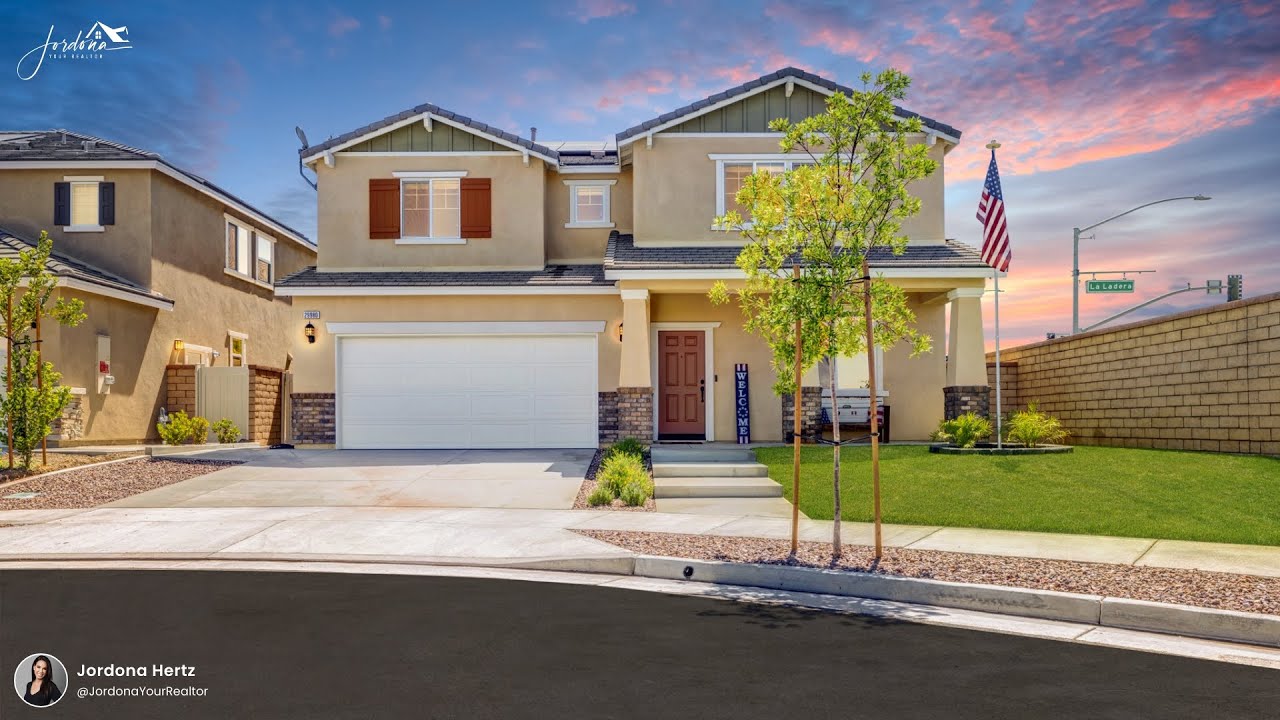 OWNED SOLAR, MAIN FLOOR BED AND BATH, ON CUL-DE-SAC, 2 MIN WALK TO CLUB HOUSE/POOL & NEW MIDDLE SCHOOL. Welcome home to this stunning 5 bedroom, 3 bath, 2600 sqft home on a POOL SIZE LOT home located in the highly desirable community of Audie Murphy Ranch in Menifee. As you enter the property you are greeted by an extra wide driveway, lush landscaping, and inside the home, tall ceilings, recessed lighting, custom paint, and LVP flooring throughout. Off the entrance of the home is the main floor bedroom which features a walk-in closet and french doors. Also featured on the main floor is a powder room. The open concept floor plan boasts a great room with large windows allowing tons of natural light to flood the home, a nook great for a built-in entertainment center, and is open to the eating area and gourmet kitchen. The kitchen features a large island with eat up bar, granite counters, stainless steel appliances, soft close cabinets with tons fo storage, a walk-in pantry and access to the 2 car garage. The second story has plush carpet, the oversized laundry room which boasts lots of storage and the 3 secondary bedrooms and master bedroom. The three secondary bedrooms are all generously sized, one big enough to be two rooms with a barn door closet, all with mountain views and share a secondary bath. The upgraded secondary bath features a dual vanity and subway tiled soaking tub shower combo. The massive master bedroom has large windows allowing tons of natural light and mountain views, and a gorgeous master bath featuring a soaking tub, standing shower, dual vanity, linen closet and walk-in closet. The entertainers yard was landscaped with turf, a putting green, planter beds, a giant aluma wood patio cover featuring ceiling fans, BBQ island and enough space for a POOL! Community amenities include pools, spas, sports courts, hiking and biking trails, skate park, club house, meeting and banquet rooms. Located in the Menifee union school district with the Award winning Taawila Elementary school, new middle school being built a block away, in the community, close to shopping and between the 15 and 215 freeway. THIS IS A HOME YOU DON’T WANT TO MISS!