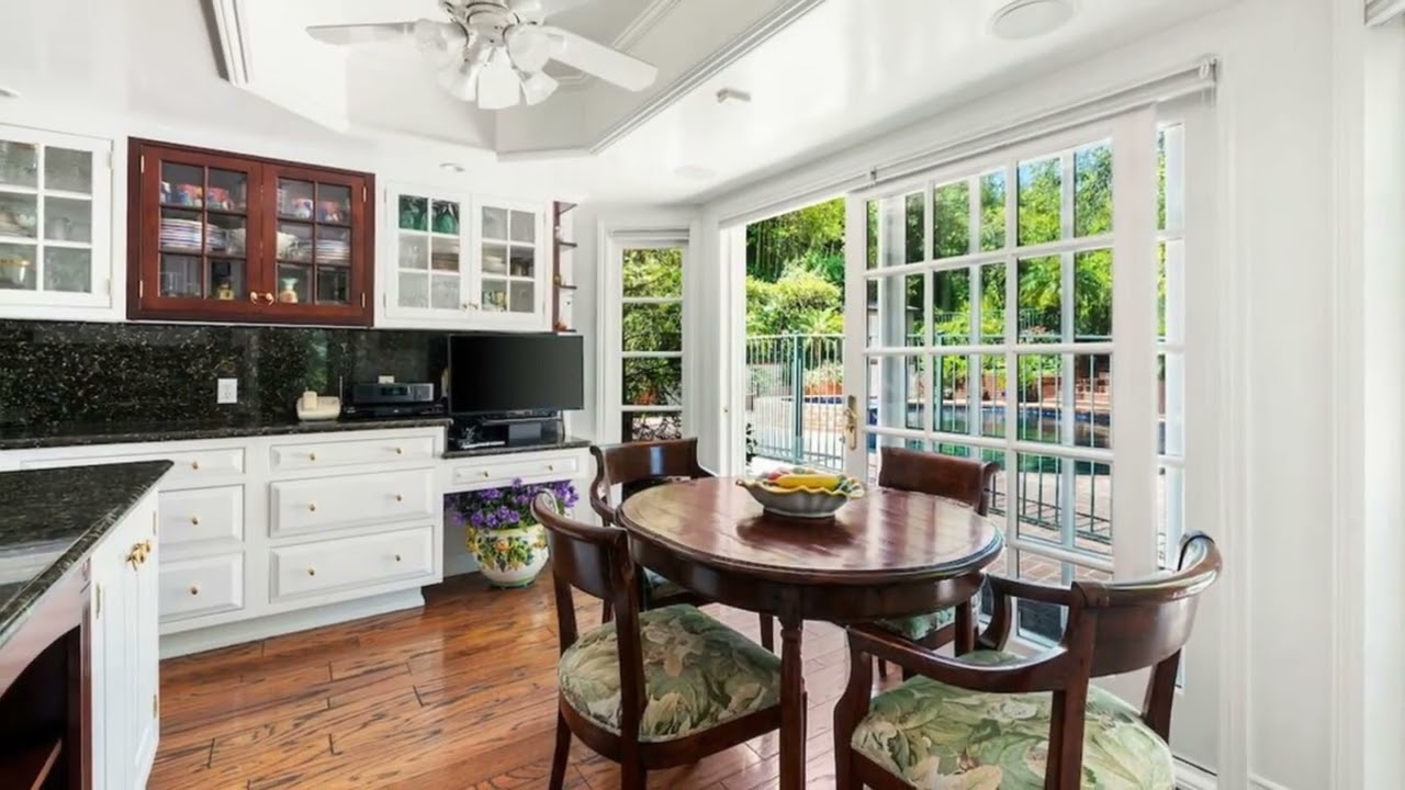 Beautiful double gated storybook tree top view home up a long driveway with plenty of parking and a separate service parking and two car garage. Arrive to the stylish red door accented by leaded glass and enter to a bright utterly impeccably kept home with high quality wood floors, windows all around amidst this majestic and peaceful setting. Spacious living room open to the dining room with French sliding doors to a poolside view, an oversized den/library perfect for screening a movie or working from home, eat-in kitchen with breakfast area and full suite first floor opening with sliding French doors to the outside. Large master suite with den and large deck to take in this rare sunny canyon property off old Hutton. 3 additional bedrooms upstairs (Master 4th). Sunlit pool with hot tub and additional spacious entertaining space. Large 32,101 sq ft lot with mature trees all around. Within the coveted Warner Ave Elementary district and minutes to the Glen Center with a gourmet market, many restaurants, shops, Starbucks, salon, pharmacy and workout studio!