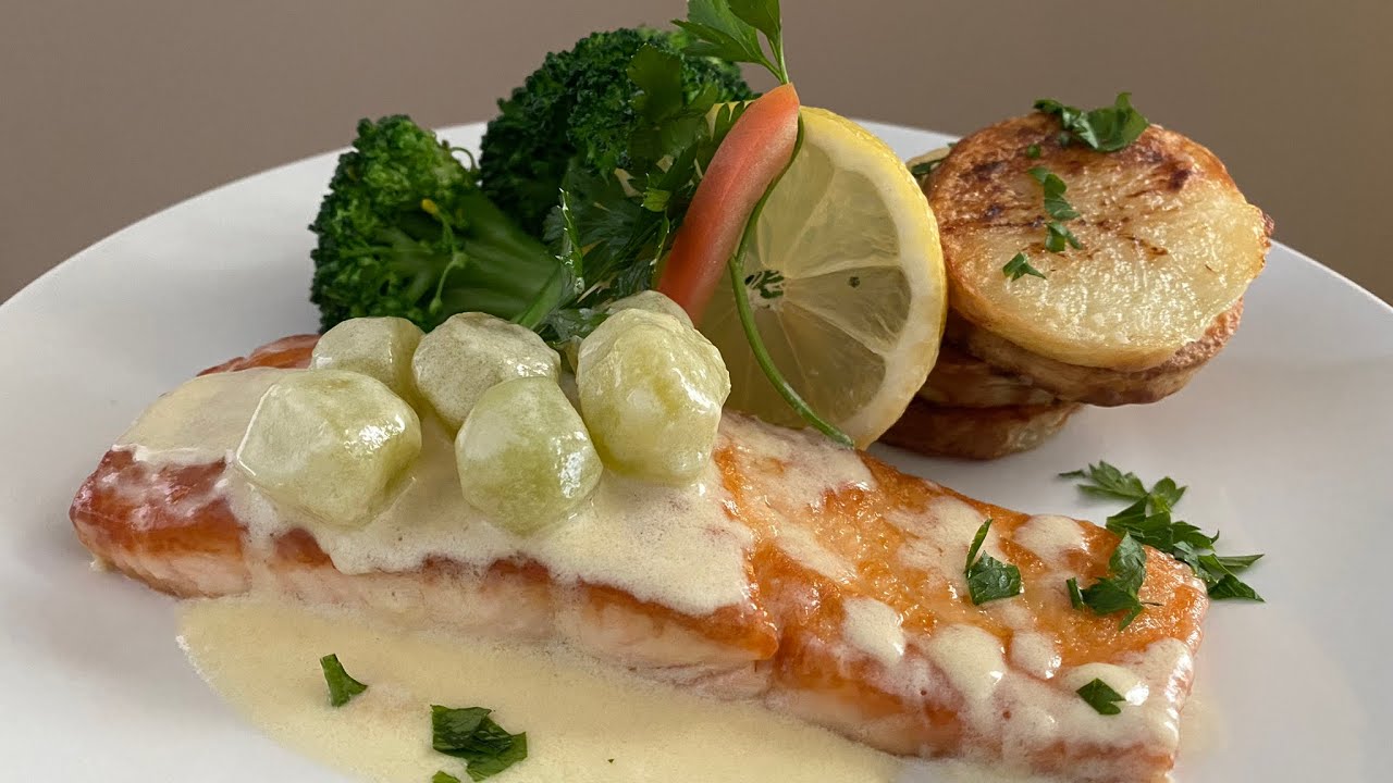4. Place the grapes on top of the salmon and ladle the sauce on the filets and grapes.