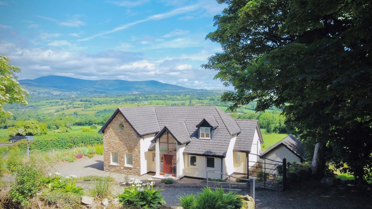 A modern, contemporary split level dormer style 4/5 bedroomed bungalow presented in turn-key condition featuring panoramic views of the surrounding countryside and mountains to include The Blackstairs mountains, White mountain, Mount Leinster and Coolafancy.