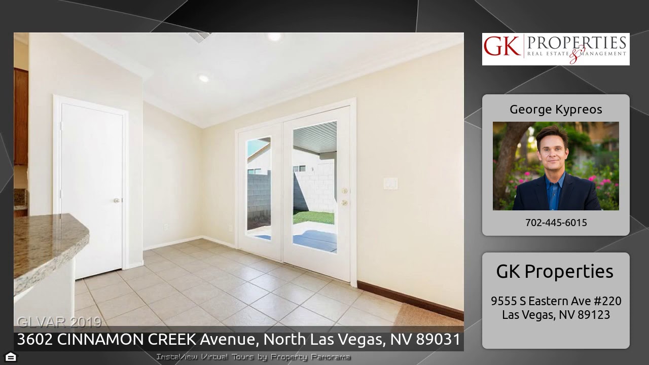 The Virtual Tour for the property at 3602 CINNAMON CREEK Avenue, North Las Vegas, NV 89031 listed for $341,900: Other homes for sale by George Kypreos of GK Properties: Spectacular SINGLE STORY 4BDRs, 3BTHs & 3car-garage in North LV. Double door entry invites into lovely foyer leading to FL Living & Dining w/vaulted ceiling, crown molding & wood-like laminate floor. Kitchen w/granite cnt, SS appls, pantry, island & breakfast bar. Sep.Family Rm w/cozy fireplace. Roomy MBDR w/French doors & MBTH w/dual sinks, tub & walk-in shower. Finished backyard w/covered patio & artificial grass. Nearby golf …
