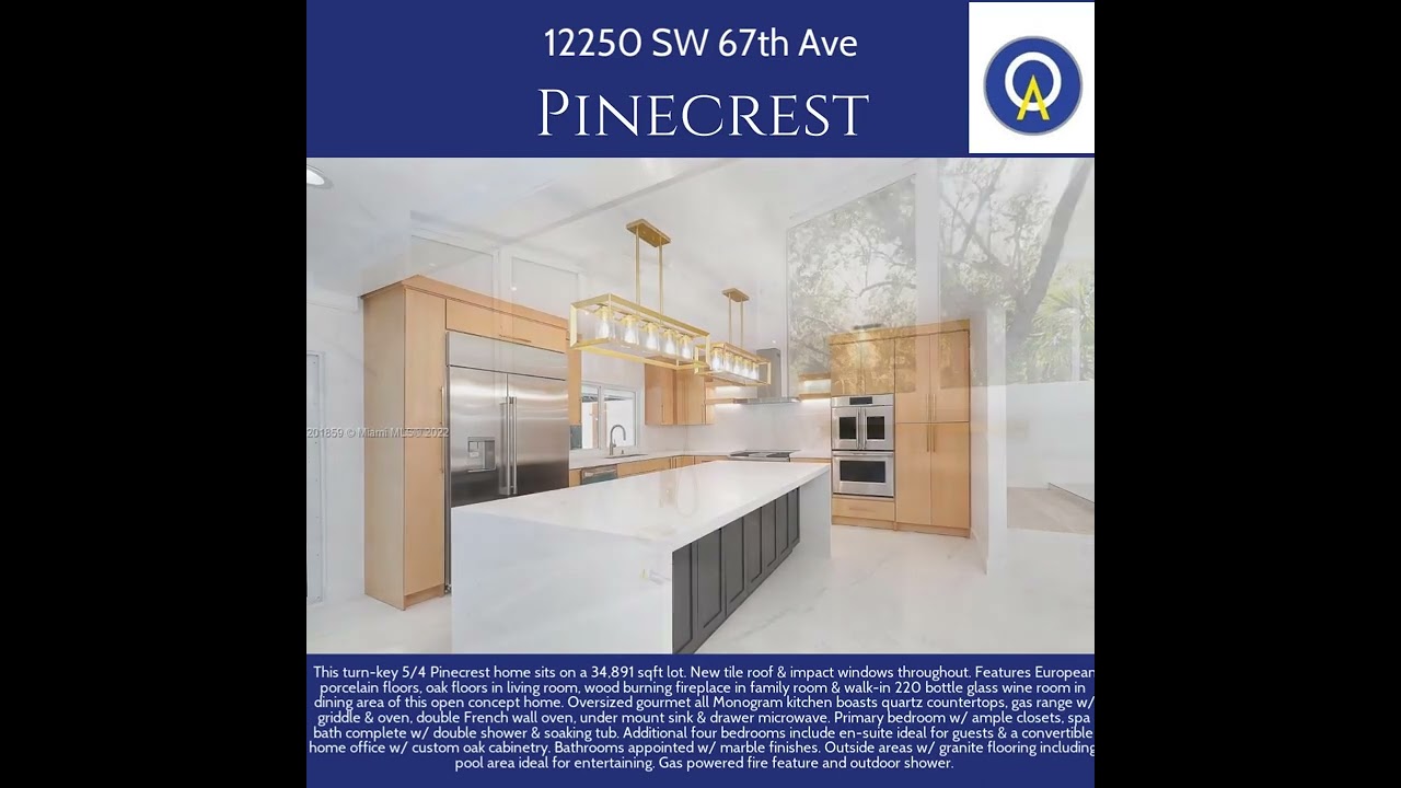 This turn-key 5/4 Pinecrest home sits on a 34,891 sqft lot. New tile roof & impact windows throughout. Features European porcelain floors, oak floors in living room, wood burning fireplace in family room & walk-in 220 bottle glass wine room in dining area of this open concept home. Oversized gourmet all Monogram kitchen boasts quartz countertops, gas range w/ griddle & oven, double French wall oven, under mount sink & drawer microwave. Primary bedroom w/ ample closets, spa bath complete w/ double shower & soaking tub. Additional four bedrooms include en-suite ideal for guests & a convertible home office w/ custom oak cabinetry. Bathrooms appointed w/ marble finishes. Outside areas w/ granite flooring including pool area ideal for entertaining. Gas powered fire feature and outdoor shower. Asking $2,599,000