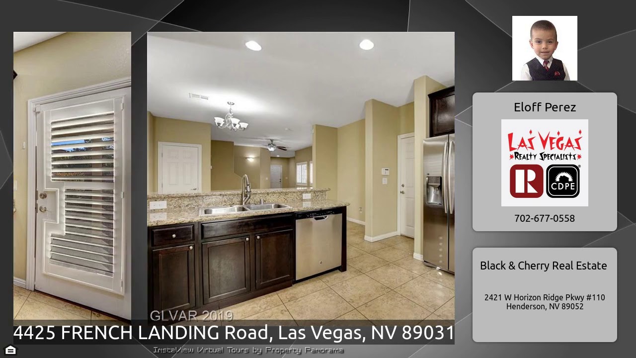 The Virtual Tour for the property at 4425 FRENCH LANDING Road, Las Vegas, NV 89031 listed for $1,750: Other homes for sale by Eloff Perez of Black & Cherry Real Estate: 3 beds, 2.75 baths, 2 car garage, open kitchen w/ granite counters, stainless steel appliances, living/dining room combo, plantain shutters, downstairs bedroom, ceiling fans, master retreat w/ walk in closet, balcony access, master bath w/ garden tub, separate shower, dual sinks, large loft/game room, private yard, covered patio, monthly landscaping included, schools, shopping, dining & entertainment nearby. NO PETS, NO SMOKING, …