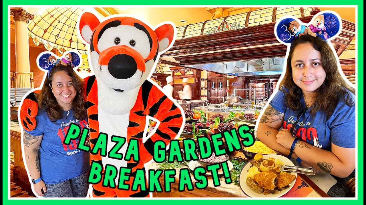 ► In this video, we have Breakfast with Disney Characters at Plaza Gardens Restaurant in Disneyland Paris. Plaza Gardens offers two breakfast seating every morning, one at 8:15 AM and one at 9:45 AM – which is the one we opted for. You normally get to meet about 6 characters at this Character Dining Breakfast, and can also enjoy and all-you-can-eat Breakfast Buffet.
