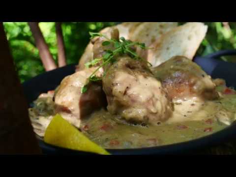 – 雞腿 ; 鹽 ; 橄欖油 ; 無鹽奶油 ; 洋蔥 ; 胡蘿蔔 ; 西芹 ; 蘑菇 ; 白葡萄酒 ; 中筋麵粉 ; 雞高湯 ; 百里香 ; 月桂葉 ; 鮮奶油 ; 雞蛋黃 ; 黑胡椒 ; 紅胡椒 ; 檸檬 ; 法式長棍