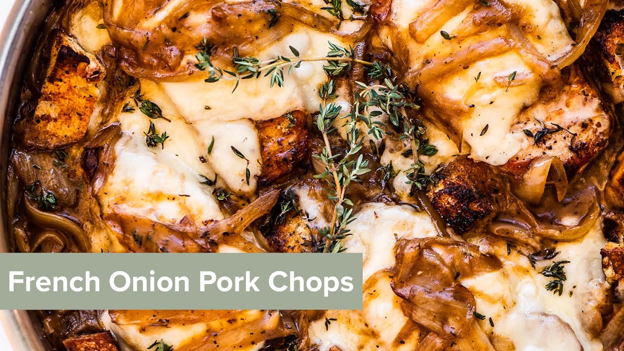 These French onion pork chops combine the classic, bold flavors of french onion soup with juicy, smothered pork chops. This ultimately comforting one-pot meal has everything you love about a cheesy bowl of french onion soup – onions slowly caramelized in wine, French herbs, crunchy croutons, and gooey Gruyere and Swiss cheese.