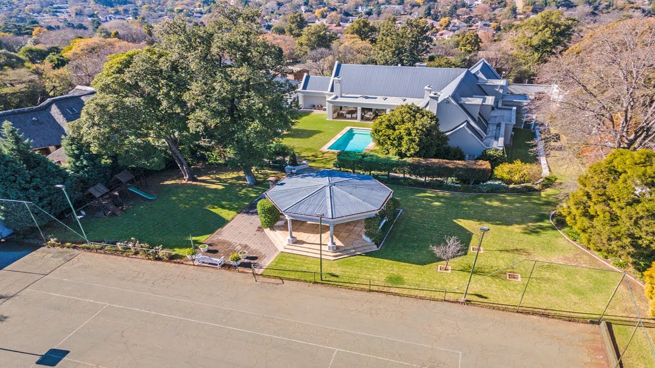 From the volumed entrance, open plan receptions with exposed ceilings and solid French-oak flooring spill to the oversized entertainer’s covered patio and swimming pool, overlooking terraced, borehole-irrigated gardens with large entertainment gazebo leading to the tennis court.
