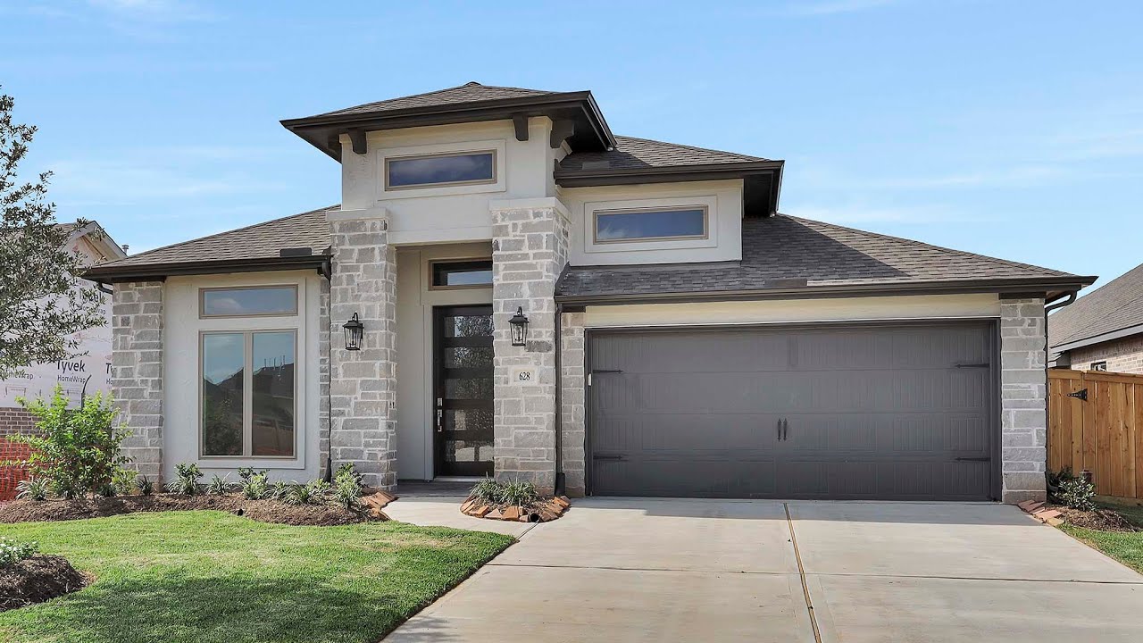 Located in Katy, Sunterra is a new master-planned community with over 1,000 acres of beautiful homes and family-friendly amenities. This 2504 sq ft plan offers four bedrooms and three full bathrooms. Home office with French doors set at entry with 12-foot ceiling. Extended entry leads to open kitchen, dining area and family room. Kitchen features corner walk-in pantry, generous counter space and island with built-in seating space. Dining area flows into family room with wall of windows and a cast stone fireplace. Primary suite includes double-door entry to primary bath with dual vanities, garden tub, separate glass-enclosed shower and two large walk-in closets. A guest suite with private bath adds to this spacious one-story home. Extended covered backyard patio. Mud room off two-car garage. #perryhomes