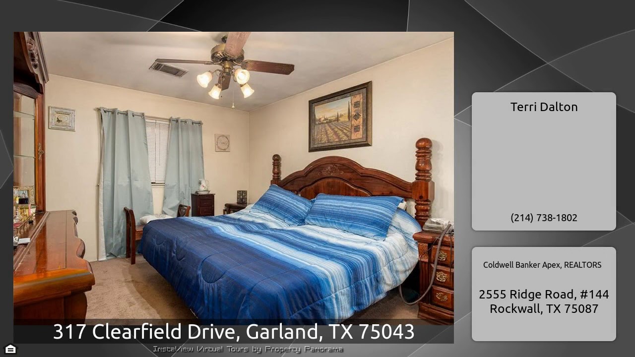 The Virtual Tour for the property at 317 Clearfield Drive, Garland, TX 75043 listed for $212,000: Other homes for sale by Terri Dalton of Coldwell Banker Apex, REALTORS: Lovely home in a lovely neighborhood. Additional fenced parking for two cars in back and a 12 X 16 workshop with electric. Close to 635 and I-30, shopping,dining, schools and Bass Park. Two living areas, one with built in cabinets and french doors to covered patio. Stainless appliances in a Large Kitchen with ample counters ,a custom pantry and glass front cabinets for display. A walk in tub with jets and large cabinet …