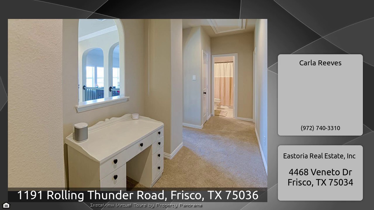 The Virtual Tour for the property at 1191 Rolling Thunder Road, Frisco, TX 75036 listed for $519,500: Other homes for sale by Carla Reeves of Eastoria Real Estate, Inc: STUNNING HOME!! POPULAR floorplan with MANY UPGRADES, in Phillips Creek! Large lot with grassy flex space next door, perfect for kids! Dramatic entry with open concept, WOOD floors, study with French doors and elegant dining. Current modern décor in beautiful upgraded LIGHT AND BRIGHT kitchen you must see in person! Exotic granite, gas cooktop, double ovens, huge work island and huge laundry. Open kitchen to den with …