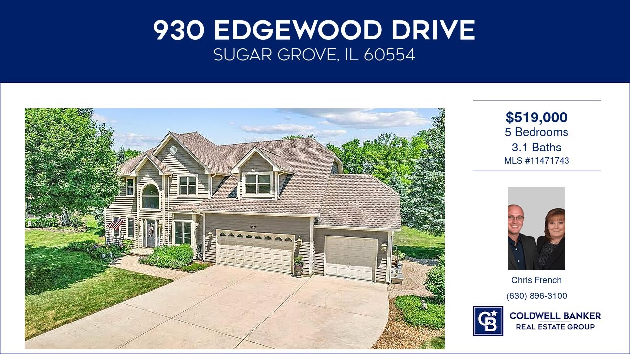 930 Edgewood Drive Sugar Grove Illinois Homes for Sale | www.coldwellhomes.com | Chris French with Coldwell Banker Real Estate Group | See full property details at | Welcome Home To This 5 Bedroom 3.5 Bath Beauty Nestled In A Quiet Cul De Sac In Black Walnut Subdivision…Home Features Gourmet Kitchen, New SS Appliances ,Granite, Updated Lighting..Cozy Family Room With Fireplace ..Formal Dining Room Has Tray Ceilings.. Formal Living Room Or Den You Choose ! Large Primary Suite Features Cedar Lined WIC, Bath With Dbl Sinks Walk In Shower And Heated Floors.. 4 Large Bedrooms And Laundry Complete The 2nd Level…Finished Basement Has Theater Room Complete With Large Screen & Surround Sound… Wet Bar Area.. Family Or Game Room , Full Bath And Sauna! If That Is Not Enough Wait Till You Walk Outside To Your Secluded Oasis, Enjoy Your Summer On The 36×20 Deck With Two Gazebos Gas Grill And Pavers For Fire Pit… 3 Car Garage ..Reverse Osmosis ..Whole House Filter System ..