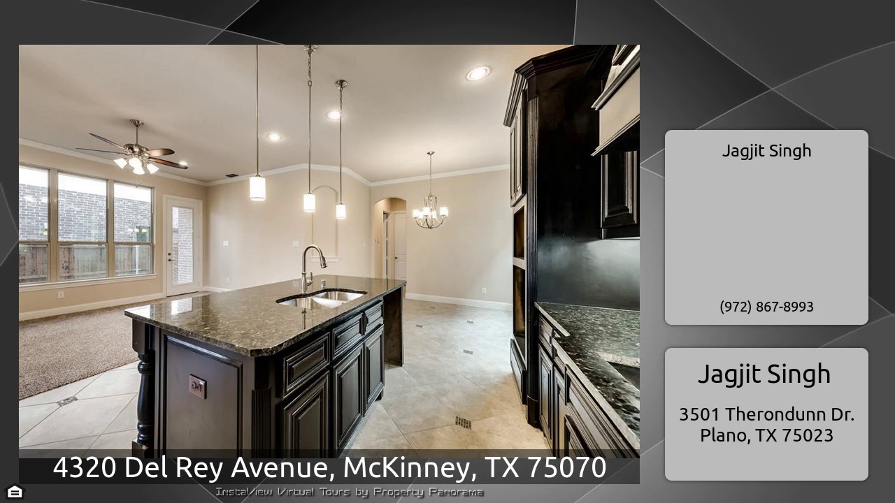 The Virtual Tour for the property at 4320 Del Rey Avenue, McKinney, TX 75070 listed for $382,000: Other homes for sale by Jagjit Singh of Jagjit Singh: Megatel Homes' Verona Plan. MOVE IN READY! This Gorgeous 2 story home , The foyer boasts of open light and elegance with two 6'x8' French Doors opening to a spacious dining room. Hardwood flooring at foyer, dining, family, kitchen and breakfast room. Granite counters, soft close cabinetry, Whirlpool SS Smart Appliance Pkg. Master Suite down with large walk in closet, oversized shower and separate vanities. Rinnai Tankless Water Heater, …