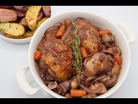 A classic French dish of chicken braised in red wine with vegetables. Rustic but elegant! Easy to prepare. Cooks in one sauté pan!