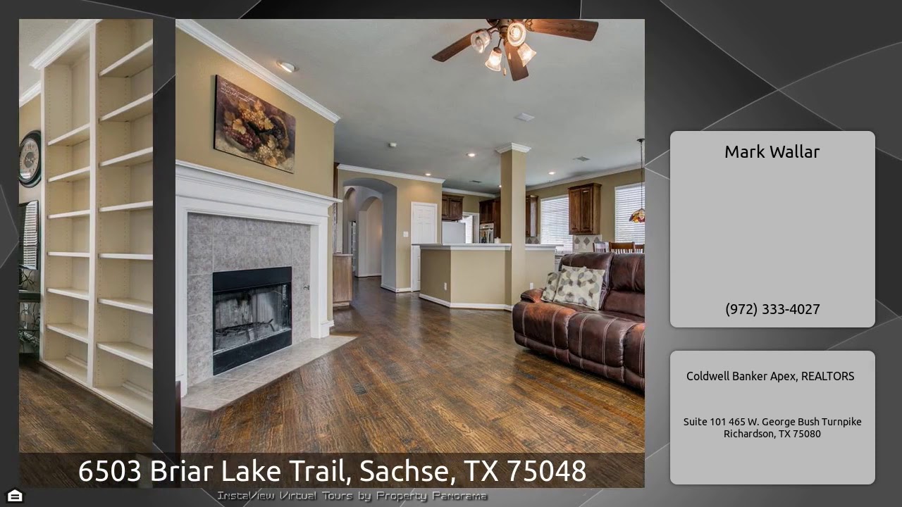 The Virtual Tour for the property at 6503 Briar Lake Trail, Sachse, TX 75048 listed for $334,900: Other homes for sale by Mark Wallar of Coldwell Banker Apex, REALTORS: Beautiful home located in Woodbridge, close to the lake, walking trails, and golf course. This is a great home with room for the entire family. The homes offers 4 large bedrooms, 2 living areas, a study with french doors, a formal dining room, and is located on a larger interior corner lot. This well appointed home shows like a model with HSHW flooring throughout the common areas on the first floor, it boast beautiful custom …