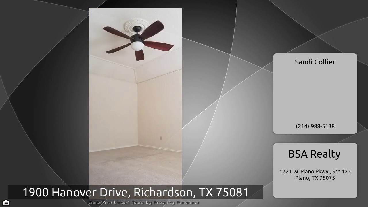 The Virtual Tour for the property at 1900 Hanover Drive, Richardson, TX 75081 listed for $2,150: Other homes for sale by Sandi Collier of BSA Realty: Looking for an ideally located, quiet neighborhood with great neighbors? This cozy 4BR, 2.5 bath home will be a great place to call home for a while. It features custom wood working, paneling and built-in dining room hutch; 2 dining areas; vaulted ceilings; new Samsung Stainless Steel Family Hub French Door Twin Cooling Fridge; gas FP; glass shower in the master bath; rear-entry garage; quaint, covered patio; and sprinkler system. Don't miss …