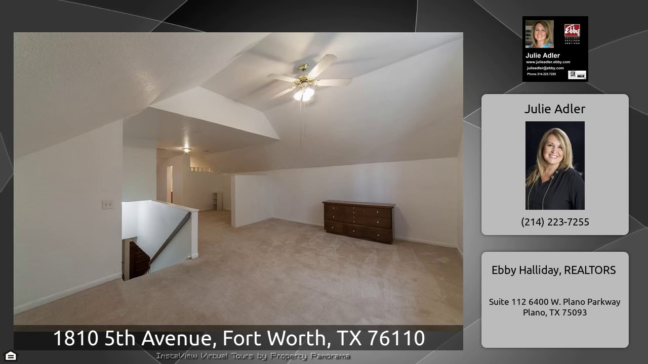 The Virtual Tour for the property at 1810 5th Avenue, Fort Worth, TX 76110 listed for $449,000: Other homes for sale by Julie Adler of Ebby Halliday, REALTORS: This beautiful historic home is in Fairmont Historic District and on an OVERSIZED lot! This home was built in 1905! Great curb appeal with a huge covered front porch. Original hardwood flooring downstairs along with Family and Living Room. French doors open to large formal dining with built-ins. Painted Cabinets, Microwave and Oven Included. Over-sized bedrooms with master upstairs. Outdoors is impressive with a detached two-car …