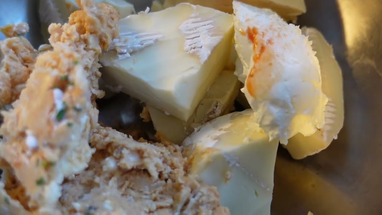 The process is very simple: You take all the leftover cheese parts from your fridge. Trim any mold, rind, or crustiness that has accumulated. Peel a few cloves of garlic. Using a food processor, blend the cheese into a coarse paste, and then make it smooth by adding a splash of wine while the machine is running. And that is all there is to it!