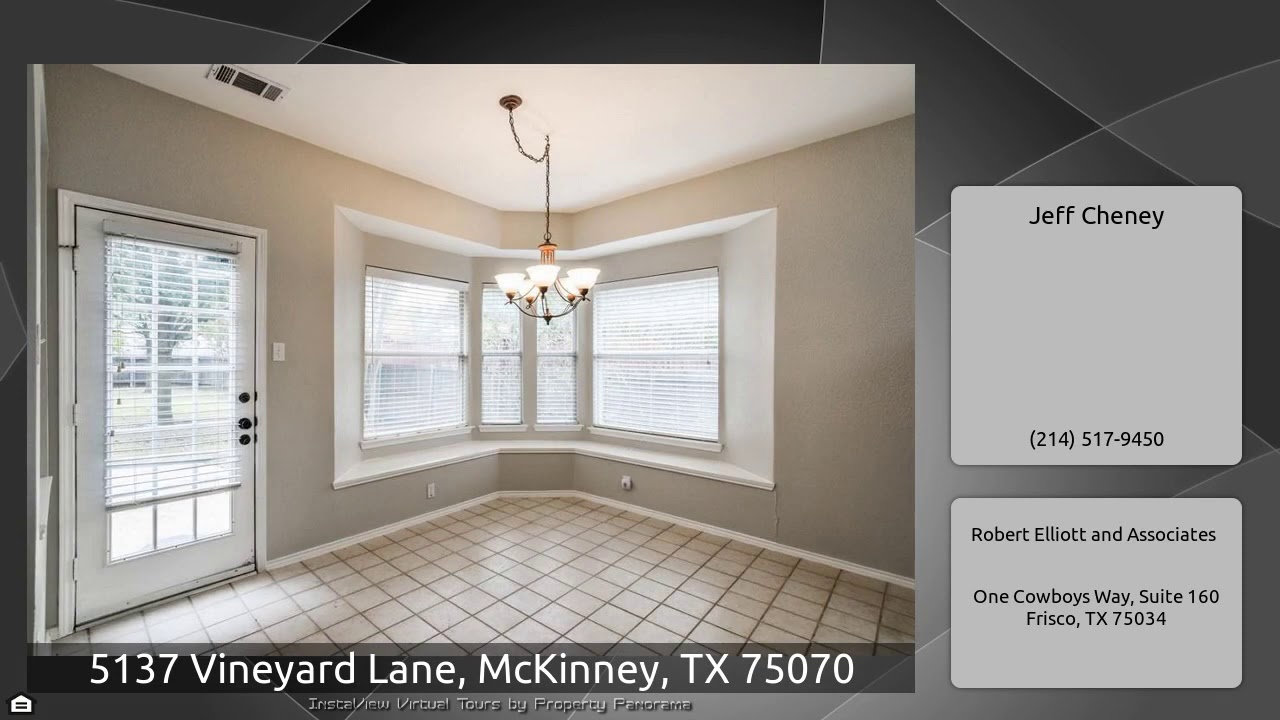 The Virtual Tour for the property at 5137 Vineyard Lane, McKinney, TX 75070 listed for $2,100: Other homes for sale by Jeff Cheney of Robert Elliott and Associates: Beautiful well-maintained home in sought after Eldorado Heights. Warm and inviting, spacious living rooms, study with French doors, fresh paint & carpet throughout. Large formal living and dining is perfect for entertaining. Spacious family room opens to kitchen Great kitchen features, gas cooktop, lots of counter & cabinet space and walk in pantry. Breakfast nook surrounded with windows and features bench seat. Private master …