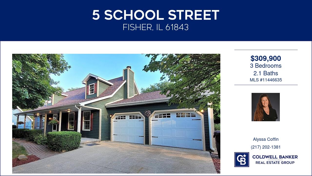 5 School Street Fisher Illinois Homes for Sale | www.coldwellhomes.com | Alyssa Coffin with Coldwell Banker Real Estate Group | See full property details at | This home offers just over 2,000 sq. ft. and an additional 600+ sq. ft. of finished space in the basement for a total of more than 2,600 sq. ft. of living space. Kitchen, dining area and living room are open giving a very spacious feel. The master suite is located on the main level. With slight modification, the bonus room on the main level could be used as a 4th bedroom. Upstairs offers 2 large bedrooms with a full bath to share and dormer storage space. In the basement you will find a finished family room and bonus area along with more than 600 sq. ft. of storage/recreation space. The French doors in the dining area lead the way to an enormous deck with privacy fence and covered grilling area. The front porch was made for enjoying the views of the commons area directly across the street, an area which is available for your enjoyment. The laundry area provides a new utility sink, folding table and cabinet space for concealing detergents and other laundry accessories. Freshly cleaned and painted and ready to move right in. Shingles replaced in 2021, Stainless steel appliances stay with the house.