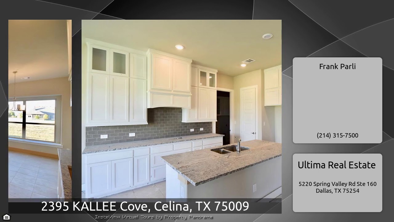 The Virtual Tour for the property at 2395 KALLEE Cove, Celina, TX 75009 listed for $449,000: Other homes for sale by Frank Parli of Ultima Real Estate: $30K PRICE DROP! Brand New one story on 1 acre in Celina! No city taxes! Beautiful brick and stone combination. Fantastic layout features Formal Dining with 12' ceiling, large Study with French Doors, HUGE Family Room with 12' ceiling, 20' x 14' Master Bedroom with 12' ceiling and HUGE closet, great Kitchen with Custom Cabinets and granite tops, 3 large bedrooms, and HUGE 19' x 14' Game Room! Hardwood floors in Entry, Study, Formal Dining, …