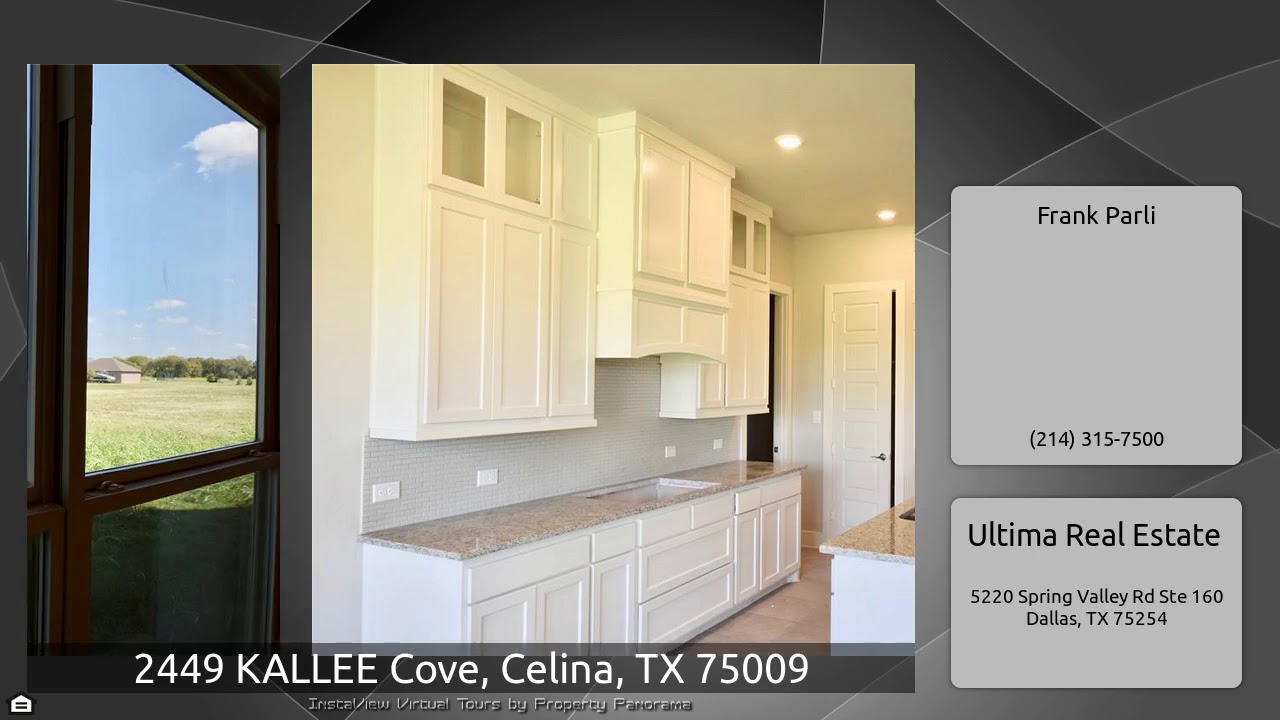 The Virtual Tour for the property at 2449 KALLEE Cove, Celina, TX 75009 listed for $459,000: Other homes for sale by Frank Parli of Ultima Real Estate: $30K PRICE DROP!! Brand New one story on 1 acre in Celina! No city taxes! Beautiful brick and stone combination. Fantastic layout features HUGE Formal Dining with Panned ceiling, large Study with French Doors, HUGE Family Room with 12' ceiling, 20' x 14' Master Bedroom with 12' ceiling and HUGE closet, great Kitchen with Custom Cabinets and granite tops, 3 large bedrooms, and HUGE 18' x 18' Game Room! Hardwood floors in Entry, Study, Formal …